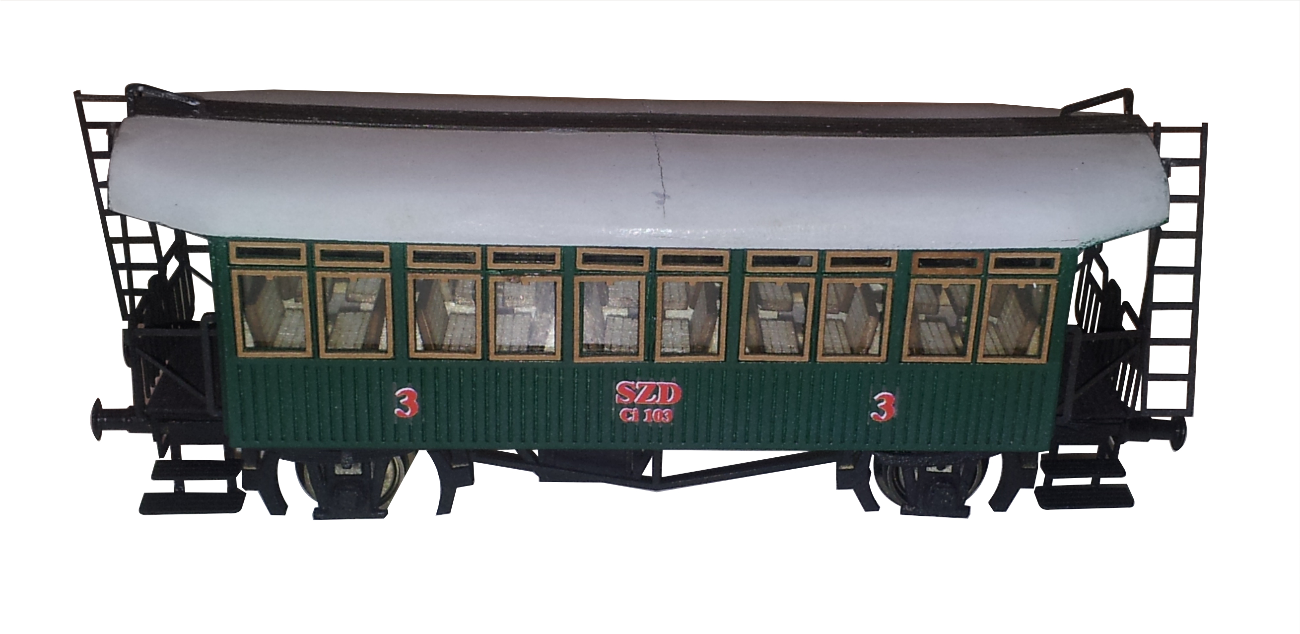 Model osobního vozu ČSD nebo Szd. Interiér vozu je stejně jako v originálu ze dřeva. Kovové dvojkolí. Šachta spřáhla dle NEM. Rmin 300mm.