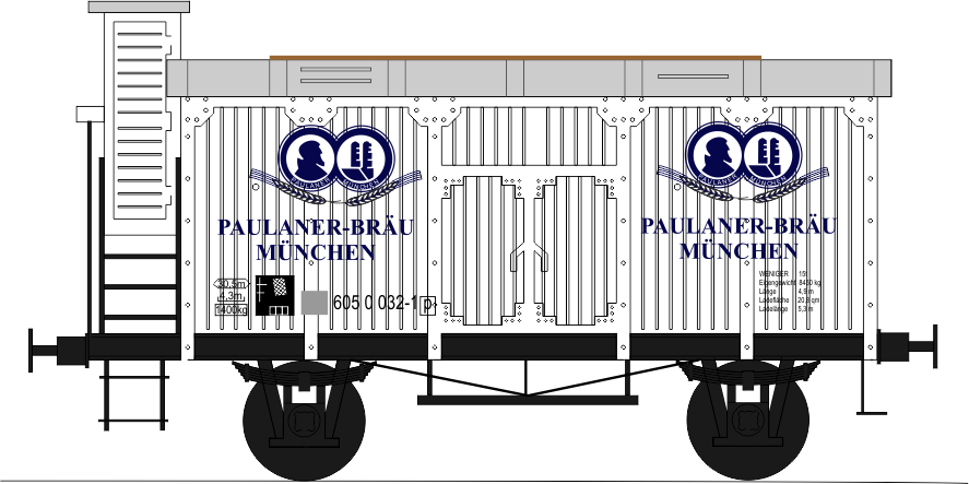 Pivovarský vůz s brzdařskou budkou. Kovové dvojkolí. Šachta spřáhla dle NEM. Rmin 300mm.