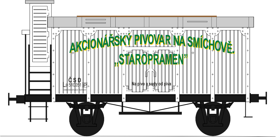 Pivovarský vůz s brzdařskou budkou. Kovové dvojkolí. Šachta spřáhla dle NEM. Rmin 300mm.