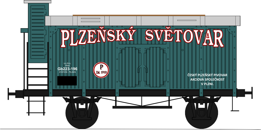 Pivovarský vůz s brzdařskou budkou. Kovové dvojkolí. Šachta spřáhla dle NEM. Rmin 300mm.