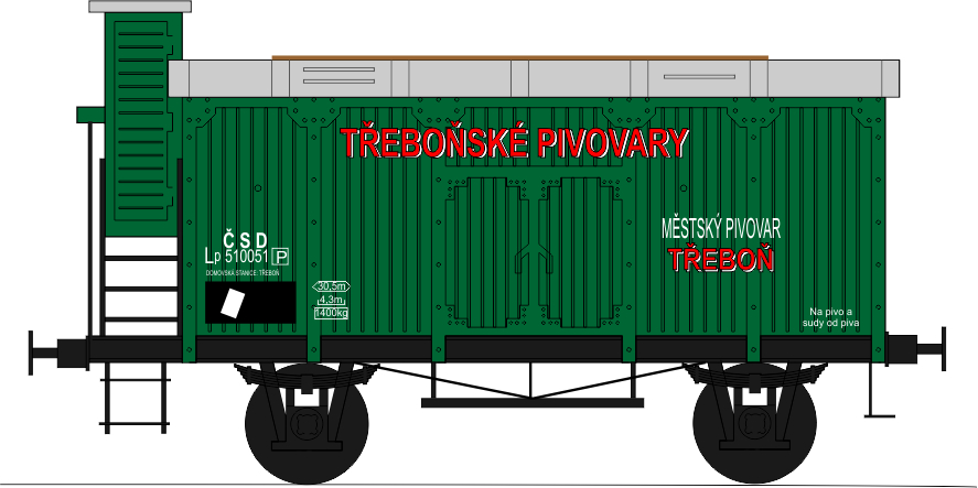 Pivovarský vůz s brzdařskou budkou. Kovové dvojkolí. Šachta spřáhla dle NEM. Rmin 300mm.