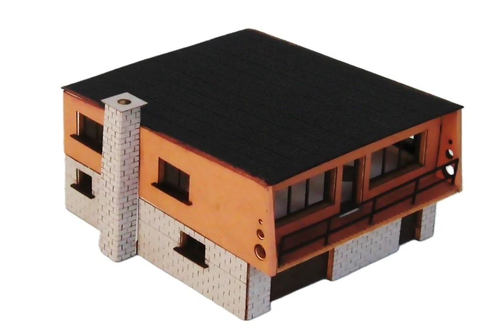 Model vyrobený Laser-Cut technologií. Materiál lepenka, barevný grafický karton, dřevo.