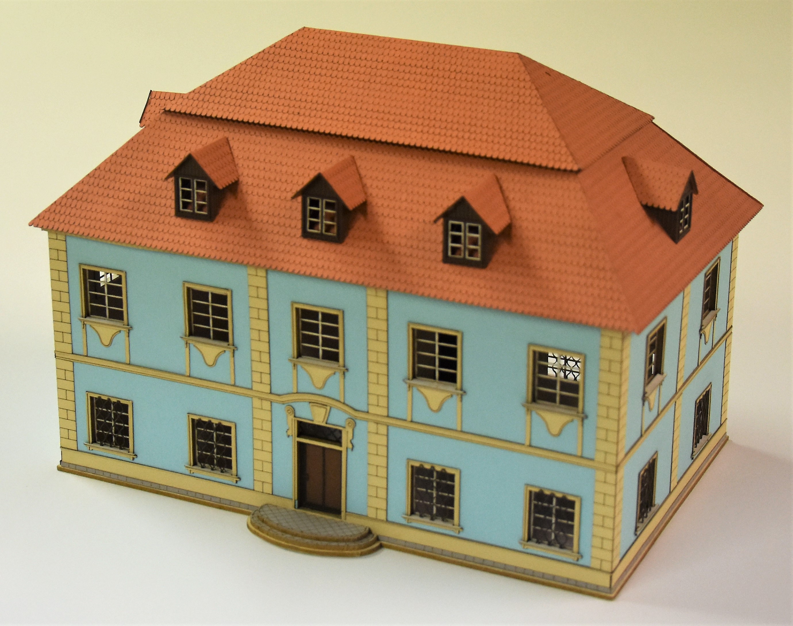 Model vyrobený Laser-Cut technologií. Materiál lepenka, barevný grafický karton, dřevo.