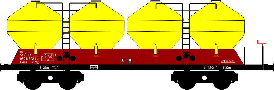 Model vozu Raj na přepravu cementu, nové spřhlo tillig, kovové dvojkolí. Rmin 286mm.